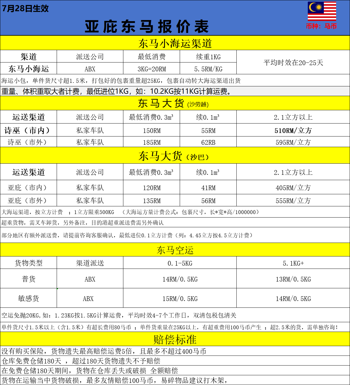* 默认体积重与实重比较,取较重者计算运费,免抛/半抛优惠请参考报价说明。